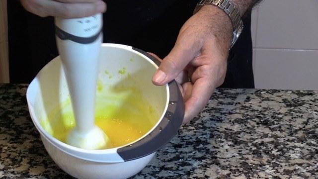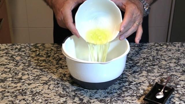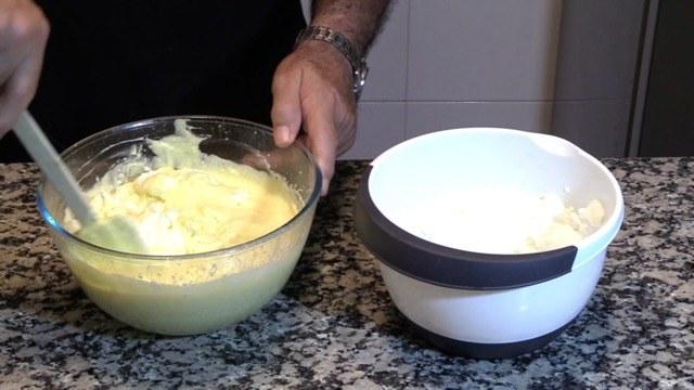 Integraremos también las claras a punto de nieve, siempre con movimientos envolventes y para que sea más fácil su integración lo haremos con un batidor manual de varillas.