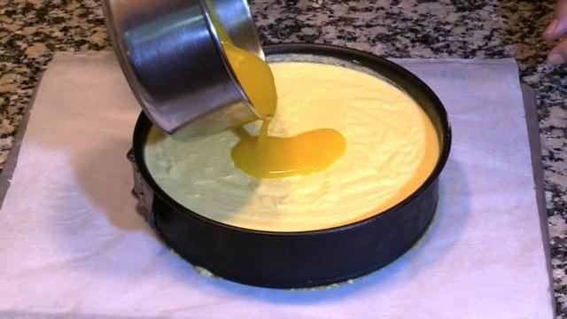 Cuando la tarta esté ya cuajada del todo le echaremos por encima la gelatina de mango. Moveremos el molde para que se vaya distribuyendo la gelatina y quede completamente cubierta toda la superficie.