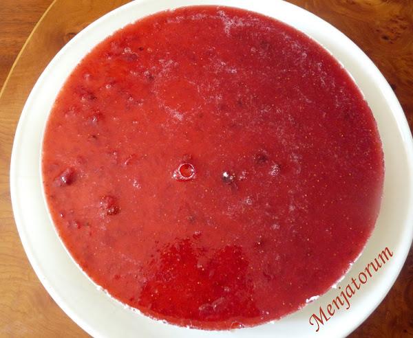 Sacar el molde de la nevera y verter la cobertura de mermelada sobre el relleno, utilizando una cuchara para romper la caída y evitar romper la tarta.
