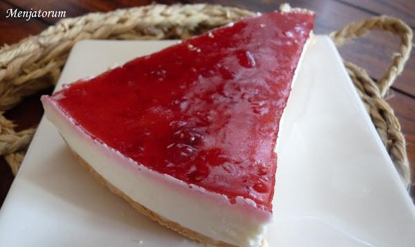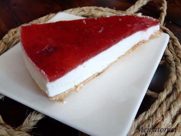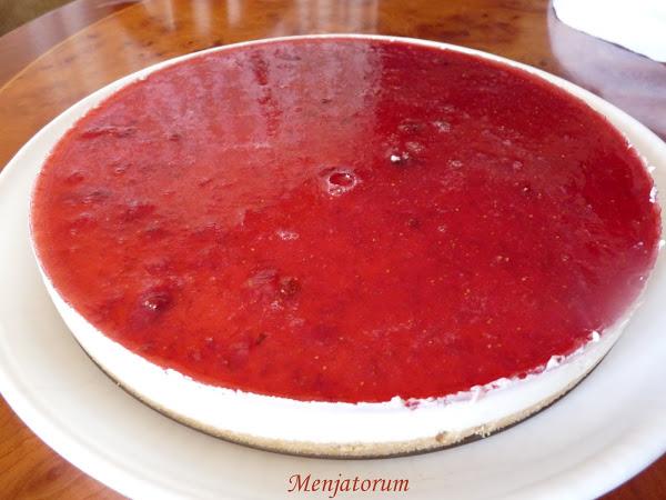 Una tarta sin necesidad de horno y muy fresquita para el verano, es esta tarta de queso con cobertura de mermelada de fresa.