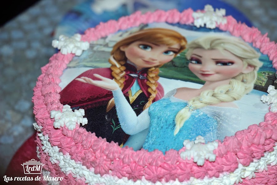 En el momento de servir o un rato antes sacamos la tarta, le colocamos la oblea de papel de azúcar y terminamos de decorar el borde de la misma con un poco más de nata (crema de leche), para que no se vea el borde de la misma. El motivo por el cual se pone la oblea un rato antes de consumir es porque con la humedad se estropea el dibujo.