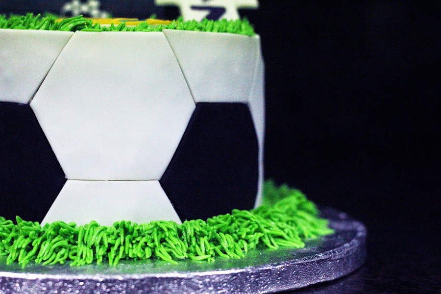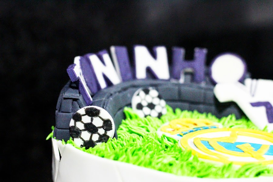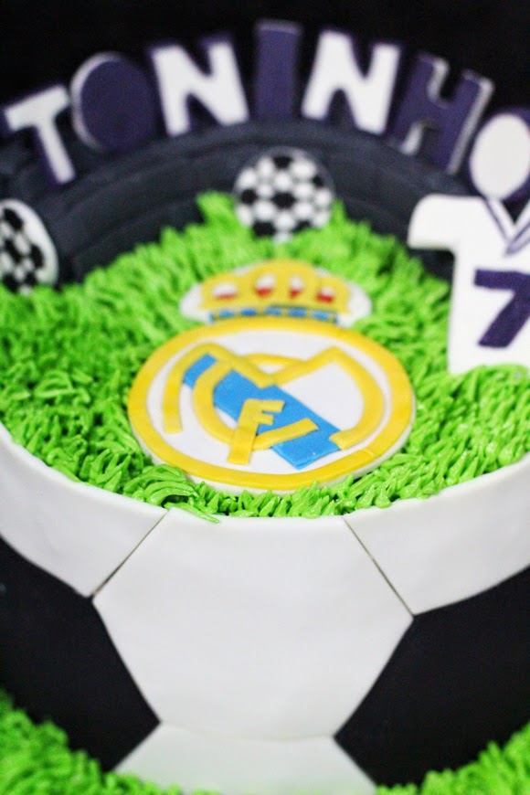 Aquí tenéis una bonita tarta de fútbol la cual estuve encantada de hacer, aunque sea la tarta lleve el escudo del Real Madrid jejejejeje yo soy del Barça, ya que es para Toni.