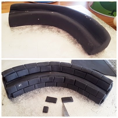 Estiramos fondant negro, 1 mm de grosor, y lo cortamos en forma de ladrillos.