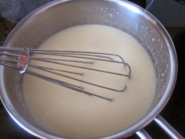Como veis usé un aro de otro molde para ayudarme en el montaje de la gouxa.Hacemos la crema pastelera, ponemos la leche en un cazo, reservamos un poco aparte, donde desleimos la maicena.