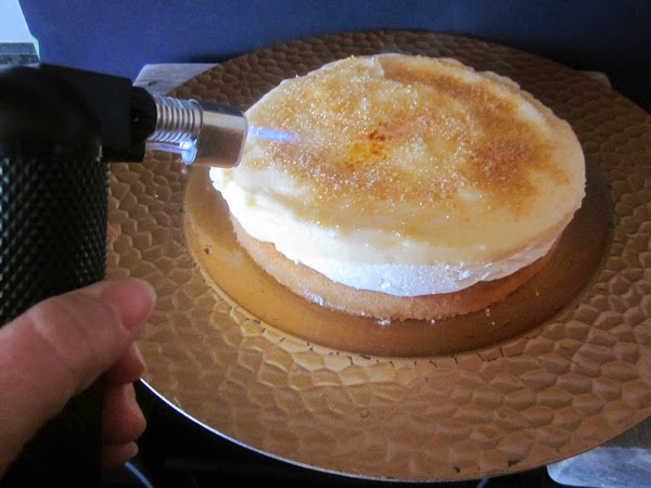 Cubrimos de azúcar y quemamos con soplete, decorando la tarta a nuestro gusto, yo le puse granillo de almendra garrapiñada.
