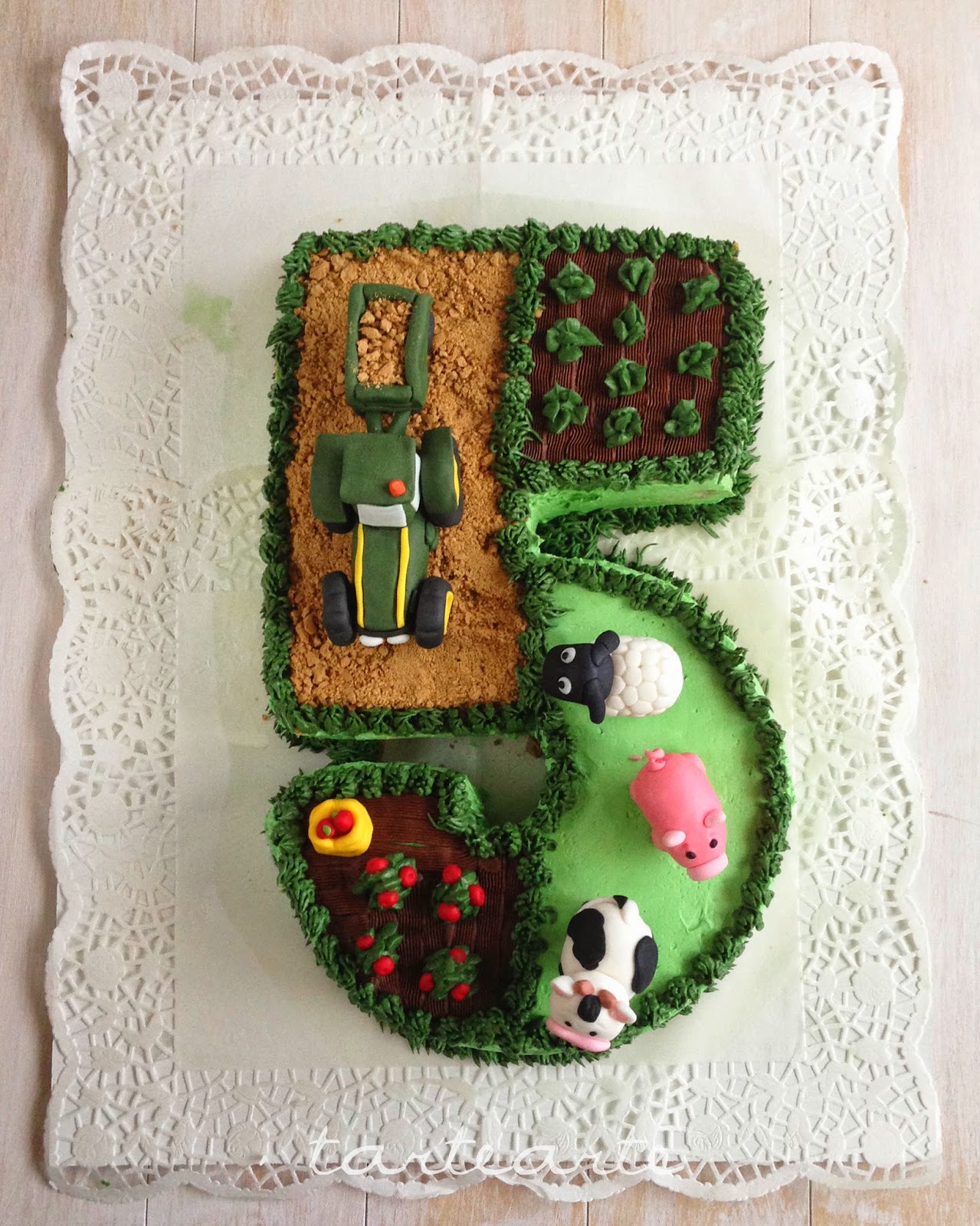 Ya le había hecho algún año mas su tarta, pero este año ha sido mas original. Ella vio una tarta con forma de 4 en internet que tenia como una granja encima, así que me pidió que se la hiciera parecida (no puedo enlazar la original porque no se acuerda donde la encontró) y con forma de cinco.