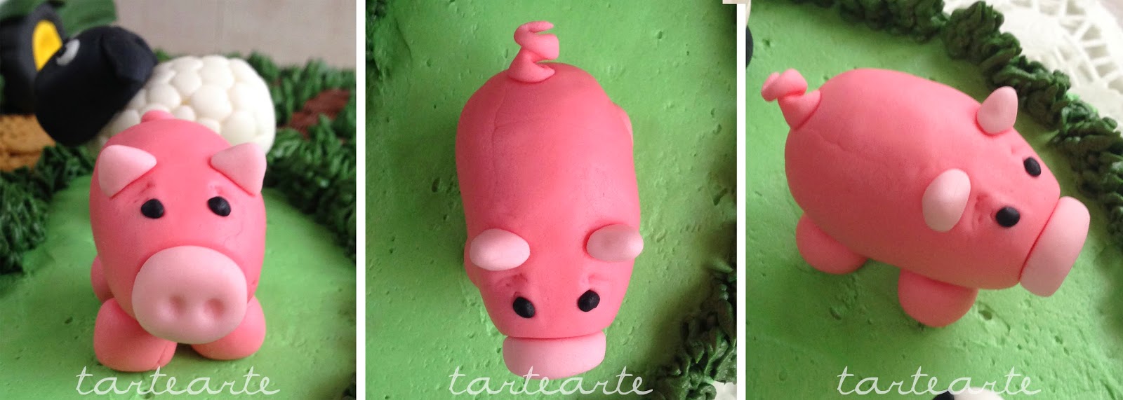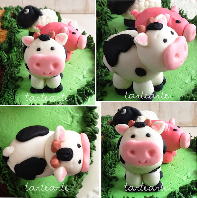 Los animalitos están hechos de fondant con cmc. Estuve buscando en internet inspiración porque no había hecho nunca una vaquita ni un cerdito y encontré estos en pinterest. Me enamore de ellos cuando los vi e intente hacerlos igual.