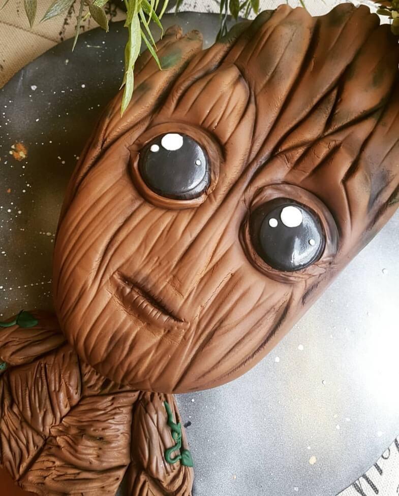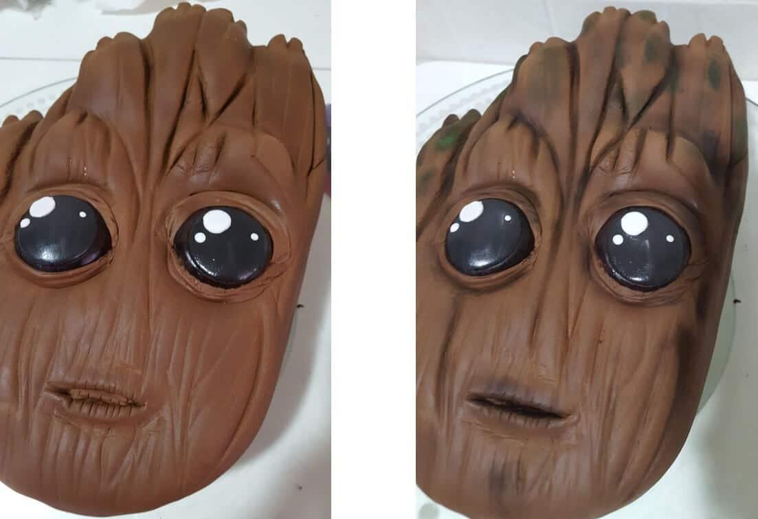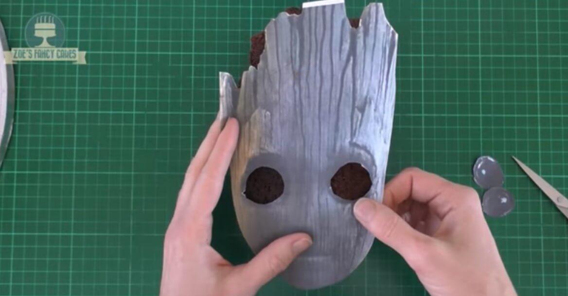 Recorté la foto por la cabeza de Groot, la utilicé de plantilla para recortar la base redonda y que me sirviera de soporte encima del cake drum para el bizcocho. Unta un poco de ganache de chocolate a la base y la tienes preparada para poner encima el bizcocho.