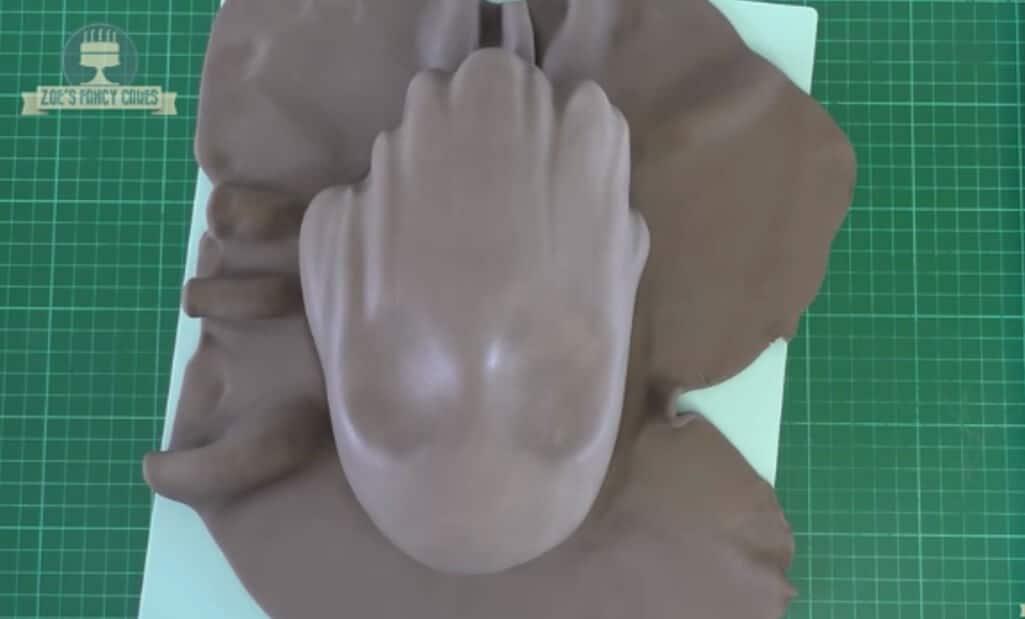 Por un lado me vino bien que no estuviera ganacheada y por otro mal. Mal porque cuando tallé todo el contorno la parte de arriba de la cabeza tiene mucho trazado y quedaron partes de bizcocho finas como para manipularlas.