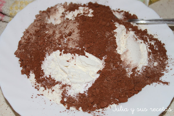 Mezclamos la harina, el cacao y la levadura.