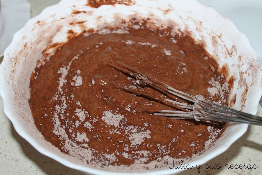 Después añadimos la mezcla de harina y cacao. Mezclamos bien.
