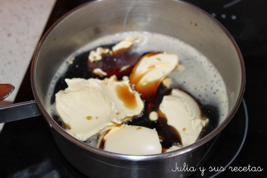 Ponemos la cerveza y la mantequilla en un cazo y la ponemos al fuego hasta que se derrita la mantequilla, sin que llegue a hervir. Reservamos.