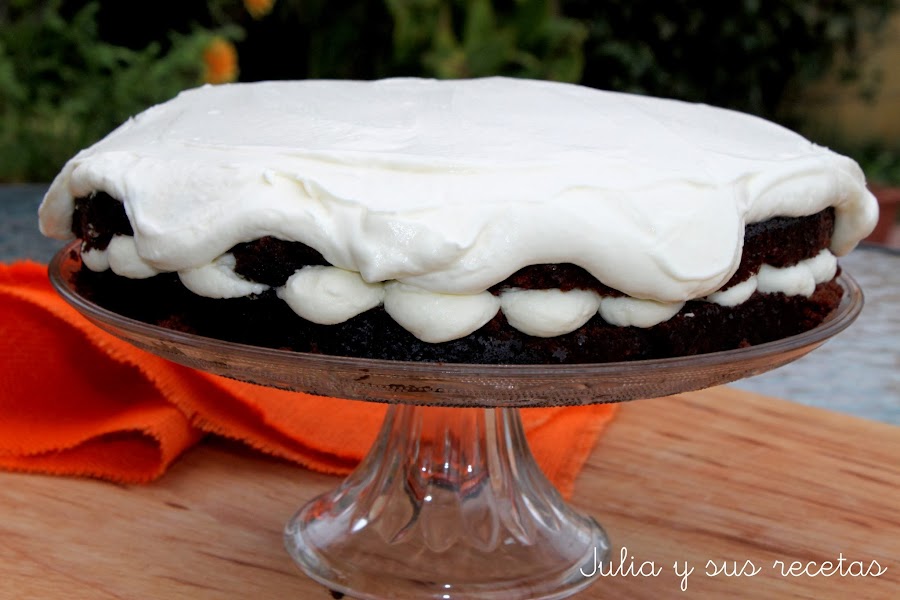 Podemos presentarlo simplemente con la cobertura por encima, o como yo, cortarlo por la mitad, rellenamos con un poco de crema de queso y el resto por encima.