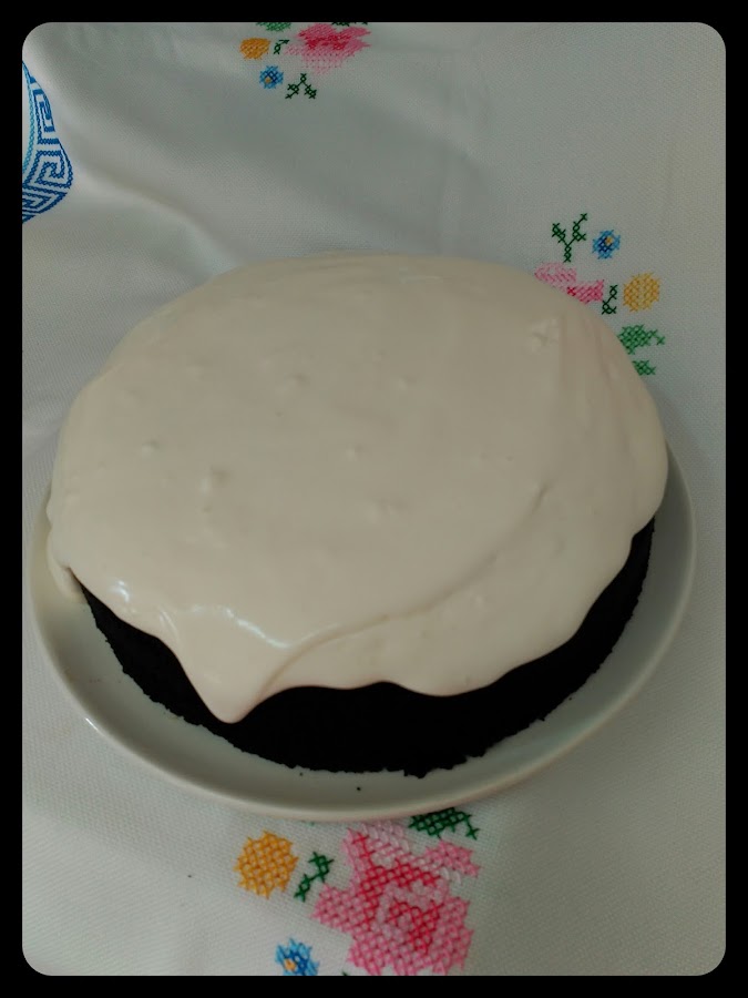 7.- Cuando el bizcocho este frio lo colocamos en la fuente donde ira emplatado y extiendes sobre él y poco a pococ a cucharadas la cobertura. De forma que no "chorree" pero que quede como si fuese la espuma de la cerveza.