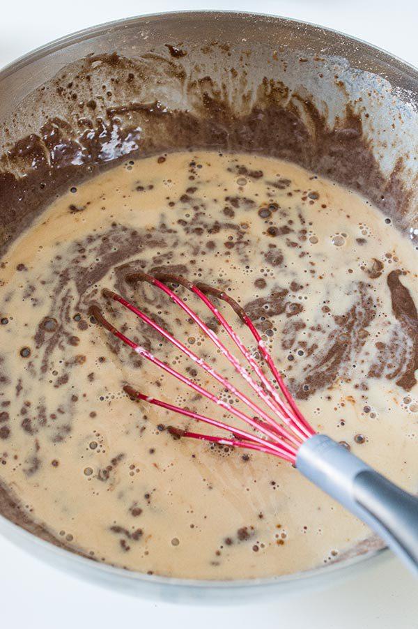 Añadimos poco a poco los líquidos a la mezcla de harina y chocolate y removemos con unas varillas, hasta integrarlo todo bien.