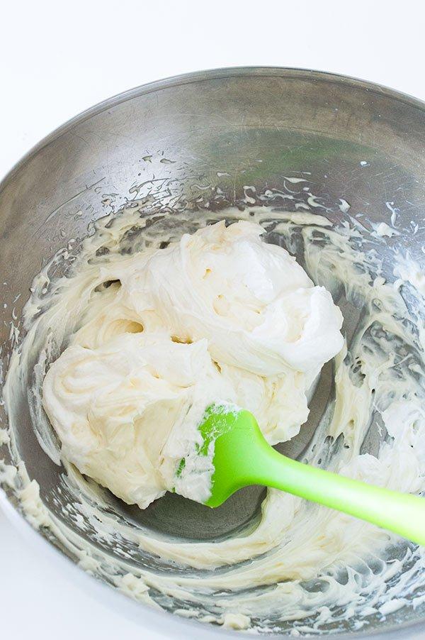 Con la ayuda de una espátula echamos sobre la mezcla de queso una buena cucharada de nata (crema de leche) y lo unimos con movimientos envolventes… lo hacemos poco a podo como en unas tres veces para que aguante mejor!