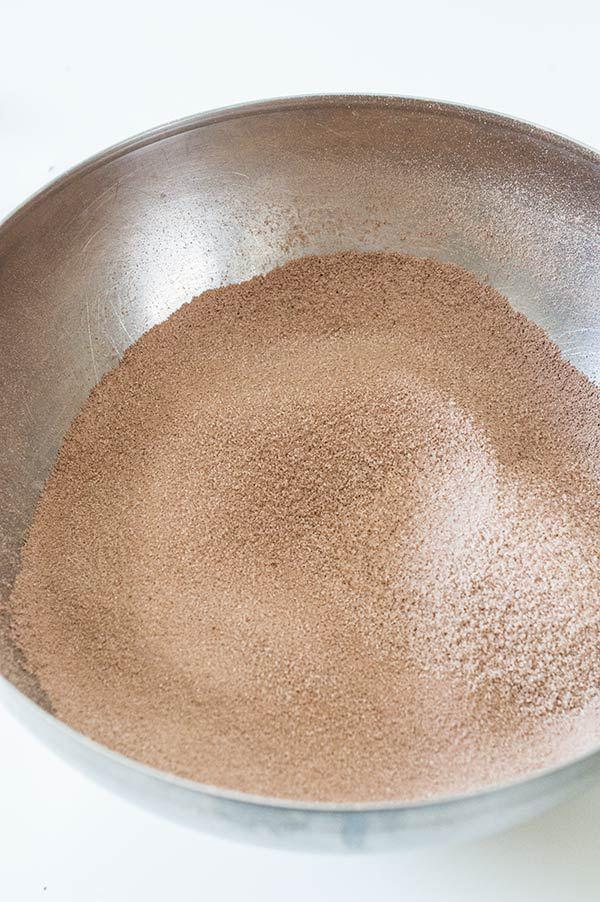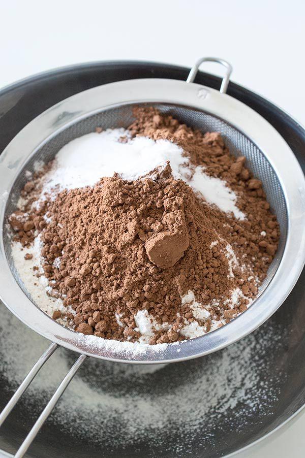 Lo primero de todo es precalentar el horno a 180º. En un bol tamizamos la harina junto con el azúcar, el chocolate en polvo y el bicarbonato.