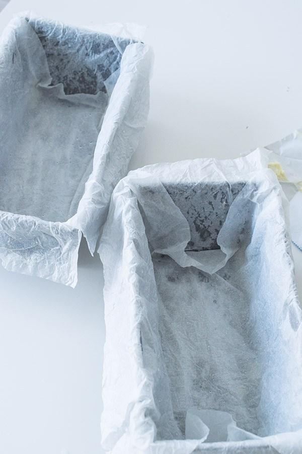 Forramos los moldes con mantequilla primero y papel de hornear después.