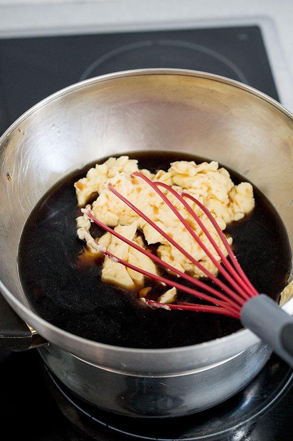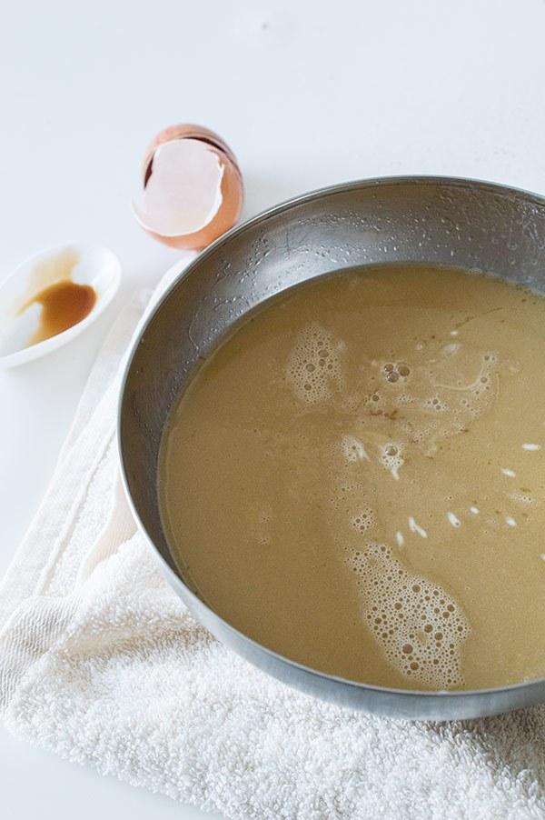 A continuación añadimos los huevos, la nata (crema de leche), y el extracto de vainilla y mezclamos bien!
