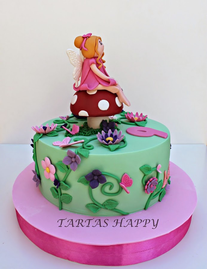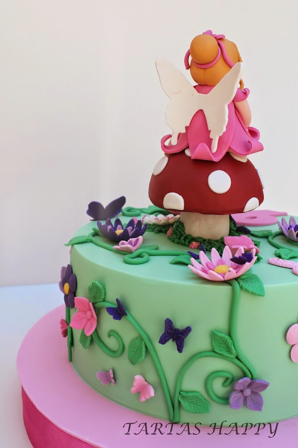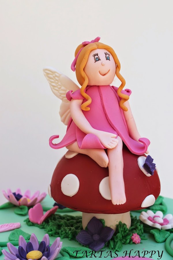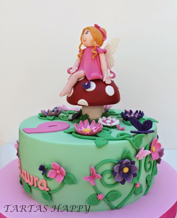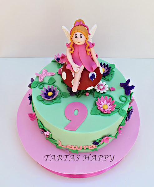 Os quiero enseñar la tarta para Laura,su madre tenia claro lo que quería,me dijo flores,mariposas y un hada y los colores en rosa y morado.