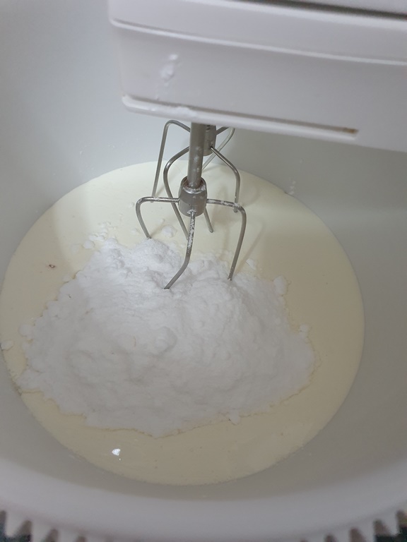 Añadimos la nata (crema de leche) y el azúcar glas en el procesador mezclamos a velocidad despacito para que el azúcar no se nos vuele por toda la cocina y a continuación subimos la velocidad y batimos .