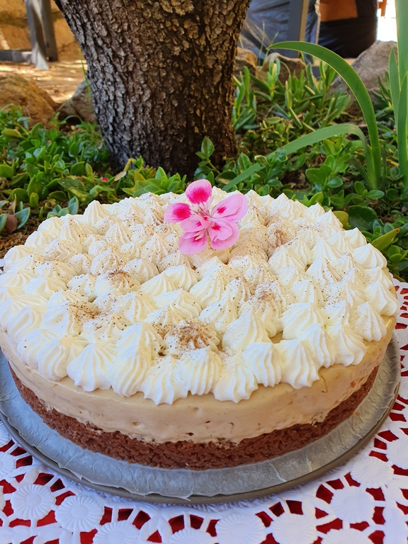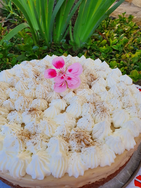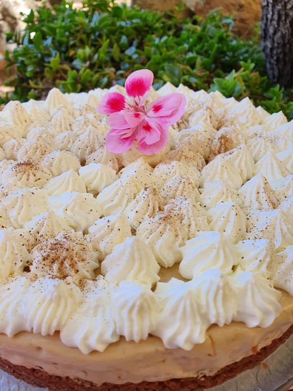Una vez congelada la tarta al día siguiente, monte la nata (crema de leche) con el azúcar glas, la decore y le añadí la canela el resultado fue genial.