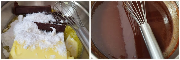 En una cacerola con un poco de agua (no hace falta que toque el fondo del bol donde vamos a derretir la mantequilla junto con el chocolate y el azúcar glas) calentamos al baño María hasta que se fundan la mantequilla y el chocolate vamos removiendo con la ayuda de unas varillas. Si veis que os queda muy solido podéis añadir un poquito de nata (crema de leche), en mi caso no fue necesario.