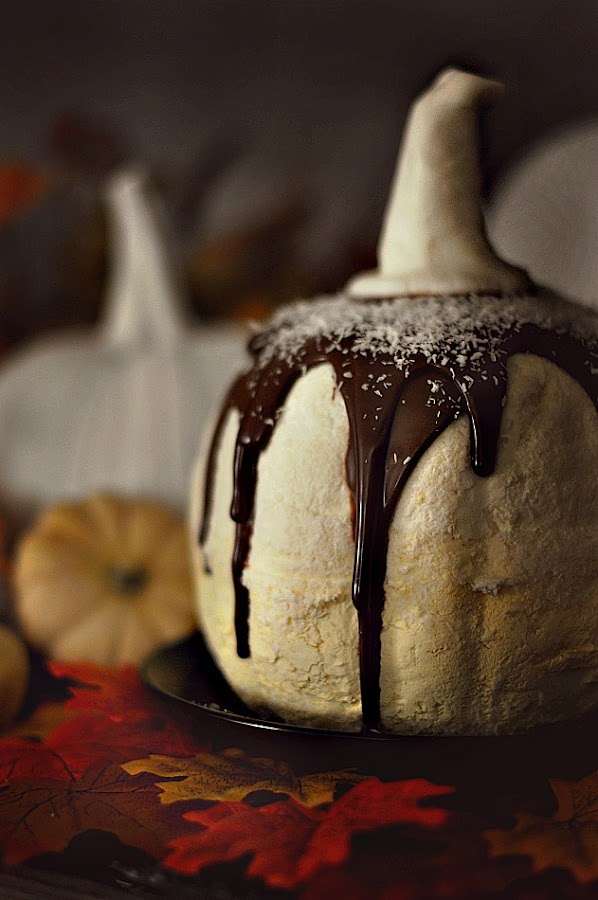 - Sacamos el mousse del molde y lo colocamos en la bandeja donde se va a emplatar. Le añadimos salsa de chocolate dejándolo correr por la mousse en forma de calabaza como muestran las fotos. Esparcir coco rallado al gusto. Ponga encima el tallo que hemos creado con fondant.