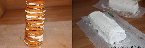 Tumbamos la torre y la cubrimos bien de nata (crema de leche) con ayuda de una espátula de manera que quede lo más liso posible.