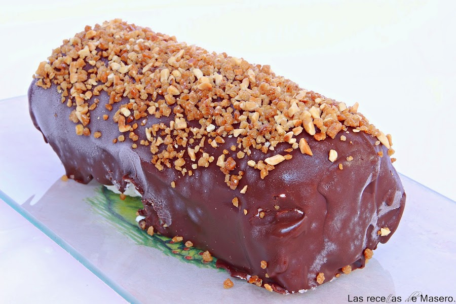 Dejamos templar unos 5 minutos el chocolate, sacamos el brazo del congelador y lo colocamos sobre una rejilla (sobre una bandeja para recoger el chocolate sobrante).Vertemos el chocolate de manera que quede bien cubierto todo el brazo.