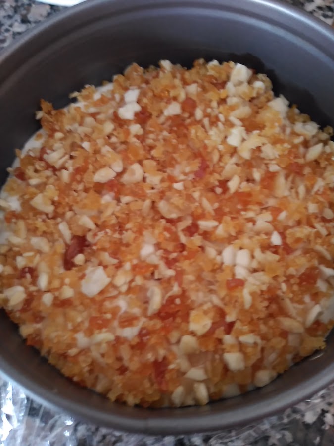 5.- Preparas molde desmontable de unos 20 cms. y colocas la mezcla de galletas y mantequilla, la extiendes bien con la cuchara aplanadola . Reserva en el frigorifico o congelador.
