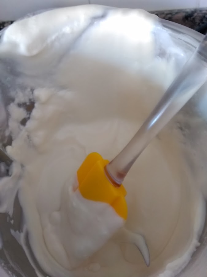 6.- Coloca la mariposa en las cuchillas. Pon la nata (crema de leche) y programa vel. 3,5 sin tiempo hasta que veas que la nata (crema de leche) esta semimontada (ha de quedar cremosa) . Baja la nata (crema de leche) hacia el fondo del vaso con la espatula e incorpora la leche condensada . Mezcla 5 seg/vel. 2,5.