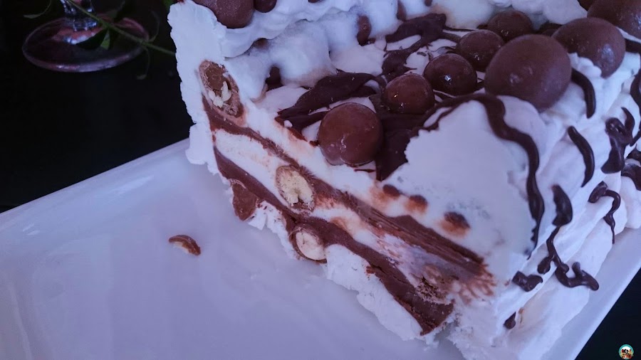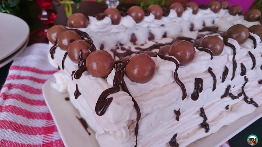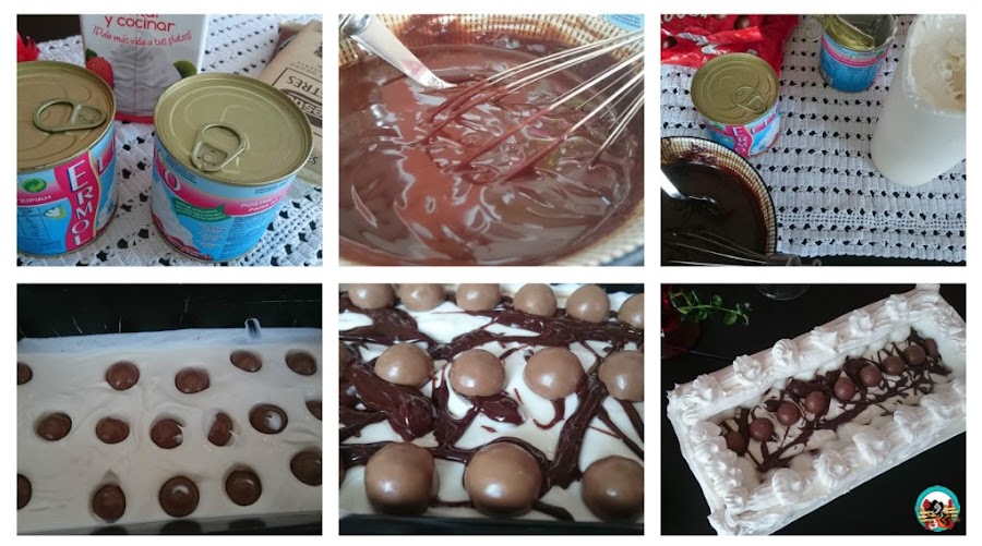 Consejo: si quieres puedes cambiar las bolas de maltesers por unas barras de ambrosía de chocolate. Siempre que utilizo nata (crema de leche) para montar lo hago con nata (crema de leche) ERMOL, una nata (crema de leche) de origen vegetal griega que se venden en las islas canarias. Es más consistente que la nata (crema de leche) normal. Con 2 botes de nata (crema de leche) Ermol y 200 ml de nata (crema de leche) para montar puedes hacer la tarta