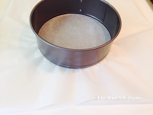 Preparamos un molde de 26cm para que quede estanco, para ello utilizaremos el truco de poner una hoja de papel sulfurizado, encerado o de horno sobre la base del molde