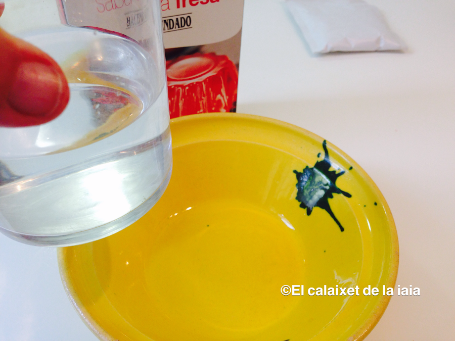 prepararemos la gelatina poniendo a hervir 100ml de agua y volcando en un bol