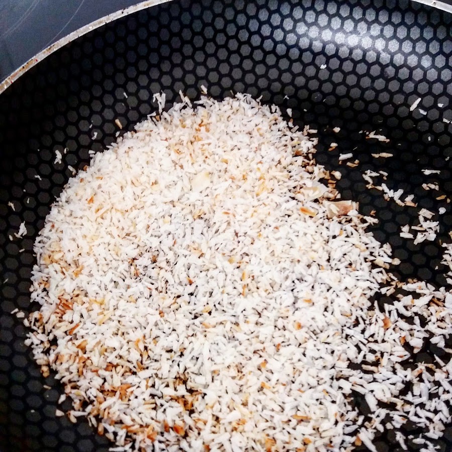 Para montar las galletas mezclamos el coco con una tercera parte de los caramelos derretidos reservando el resto del toffee.
