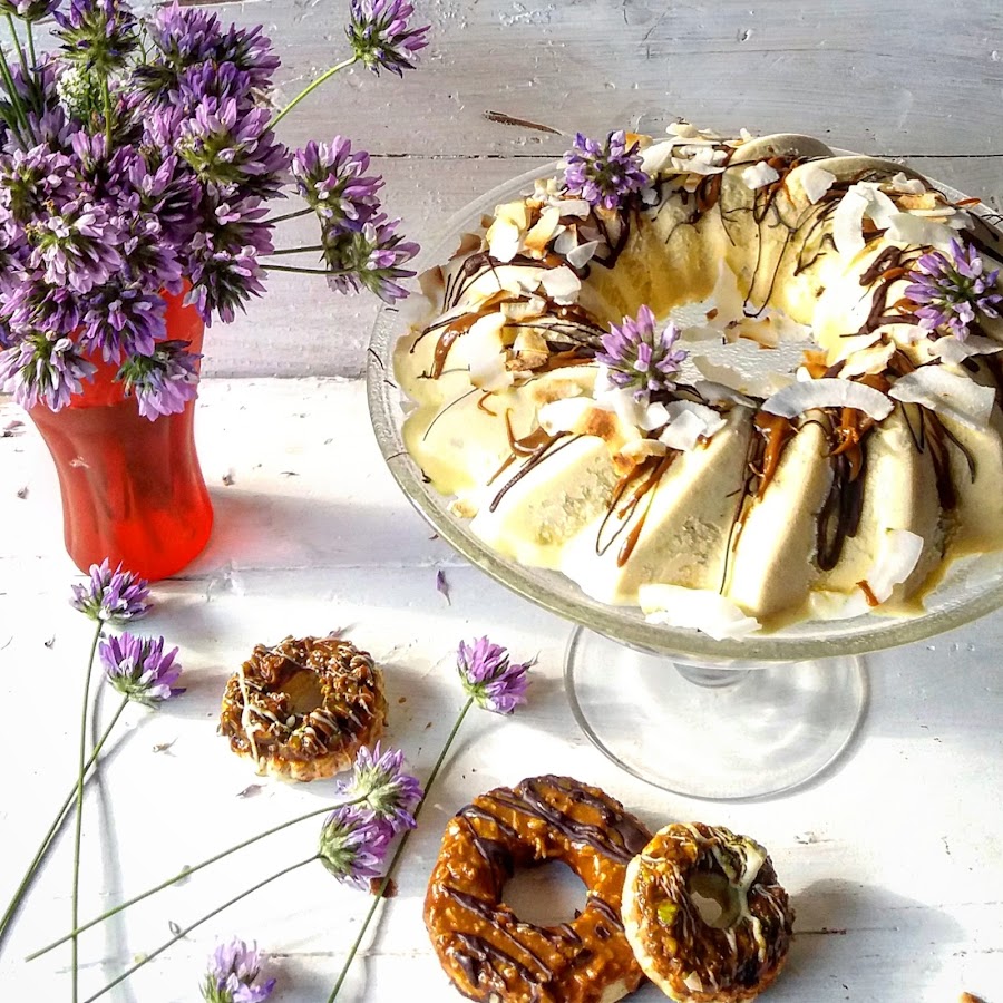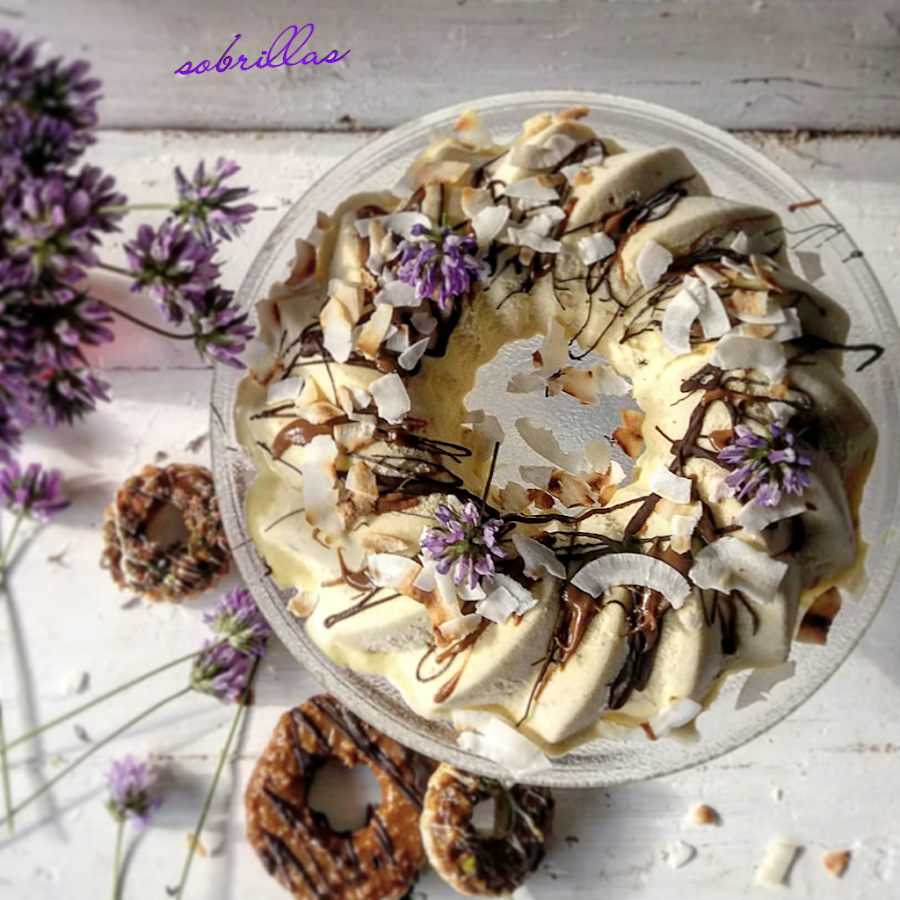 Vertemos sobre un molde de silicona y en un par de horas estará perfecta para comer. Al desmoldar decoramos con chocolate caliente y caramelos toffee derretidos.