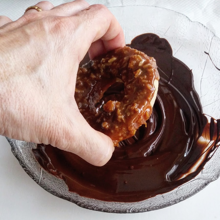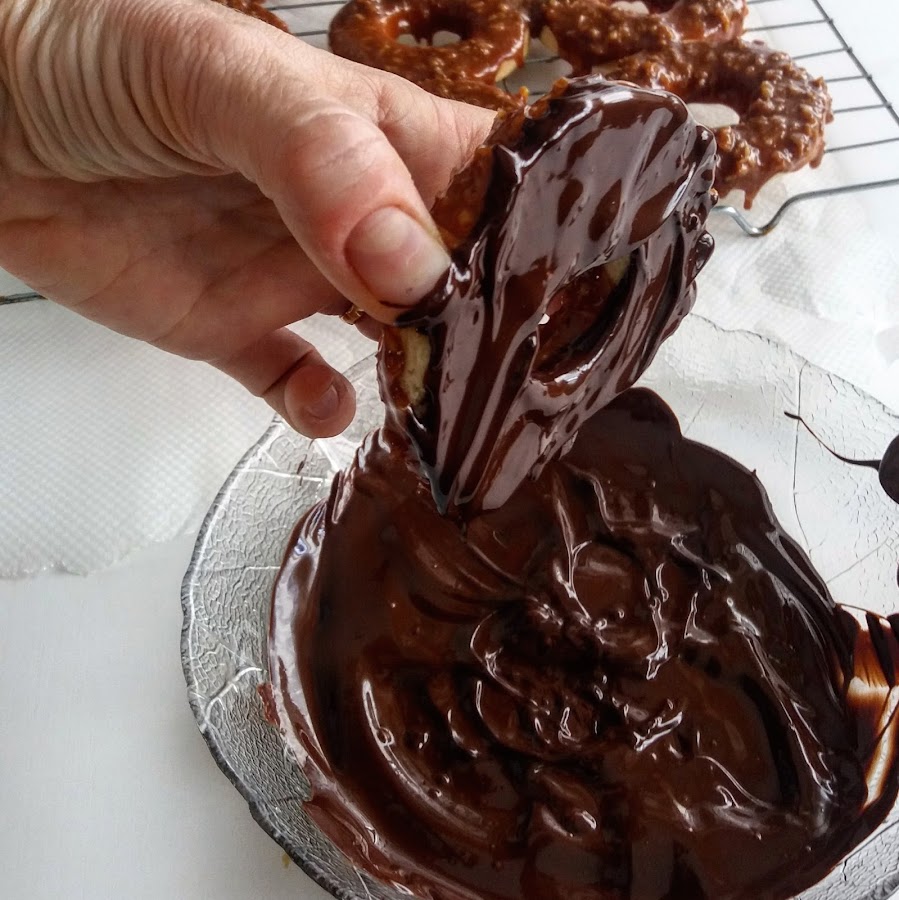 El siguiente paso es mojar las galletas por el lado que nos queda sin topping en el chocolate deshecho.