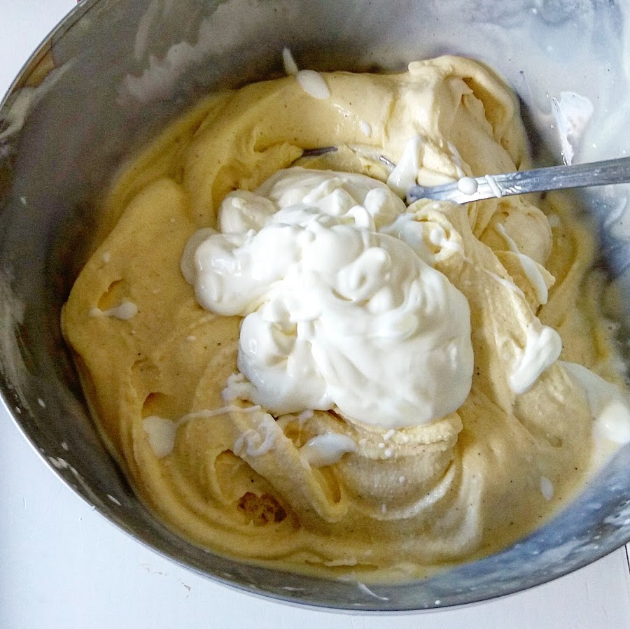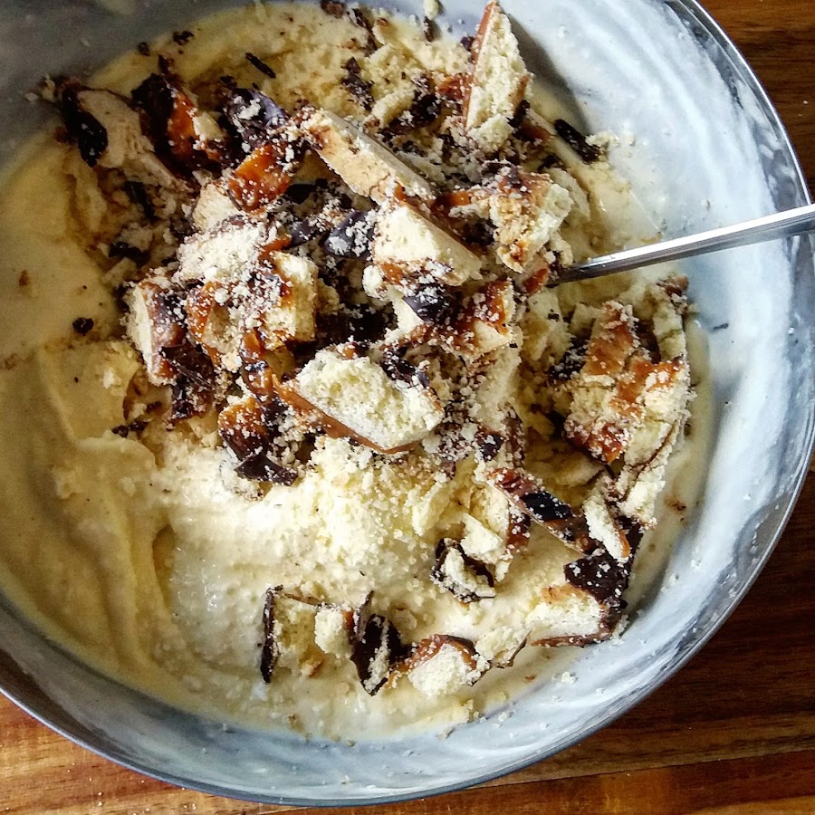 Al dia siguiente del despiste trabajáis el helado con los 100 ml de nata (crema de leche) semimontada. Añadimos las galletas troceadas.