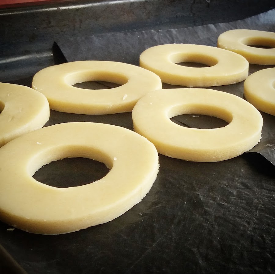Cortamos las galletas con el cortador de donuts o cualquier otro redondo usando una boquilla de manga para hacernos con el agujero central. No las cortéis muy finitas porque el topping es abundante. Yo las hice de un cm de grosor más o menos.