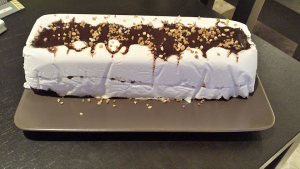 En el molde que tenemos forrado con papel vegetal añadimos sirope de chocolate, cubrimos de nata (crema de leche), volvemos añadir sirope de chocolate y galletas de chocolate a trocitos, cubrimos otra vez con nata (crema de leche) y así hasta llenar el molde, podéis hacerla de un montón de cosas (con caramelo líquido, sirope de fresa, con chocolate apto en trocitos...)ya a vuestro gusto, lo cubrimos con papel film y metemos en el congelador al menos 6h.