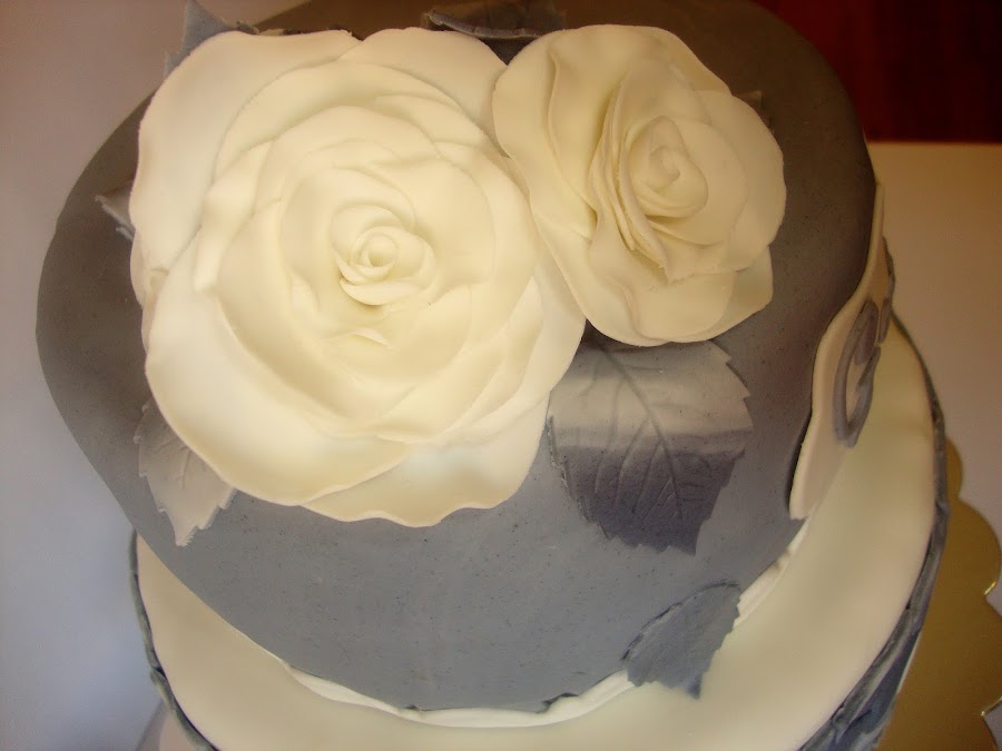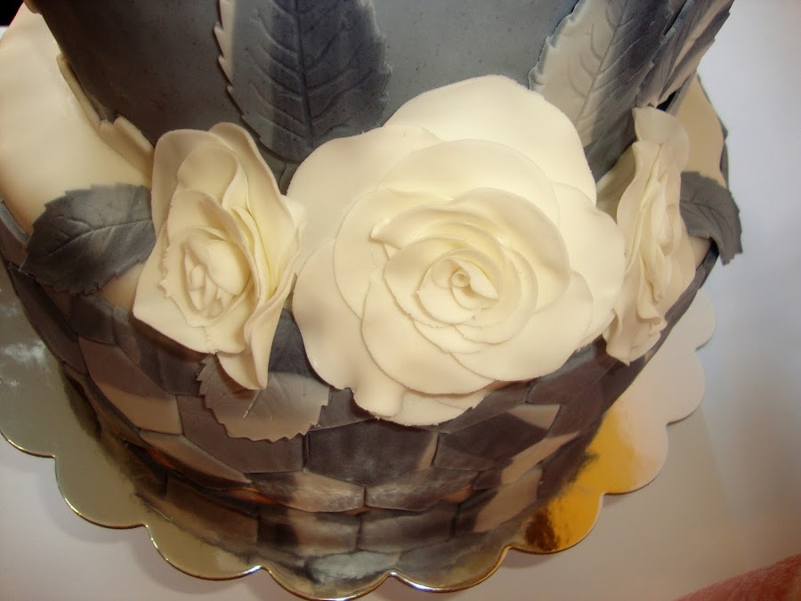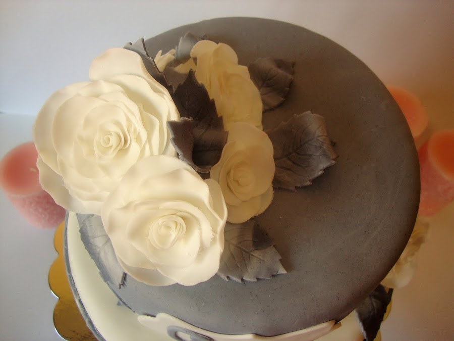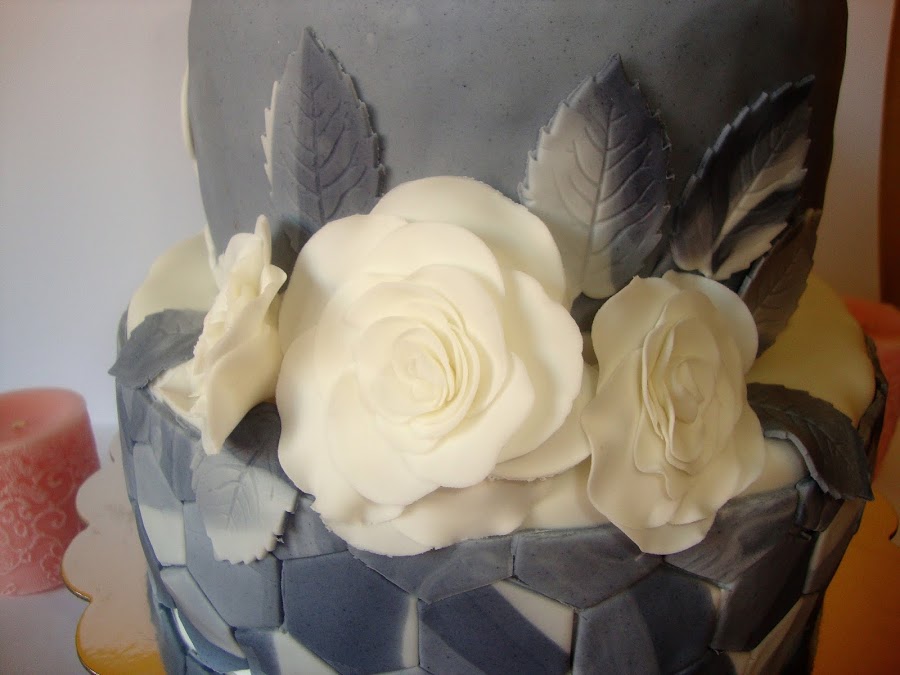 Coronando la tarta y en el lateral hay unas rosas blancas con hojas grises marmoladas realizadas con fondant.