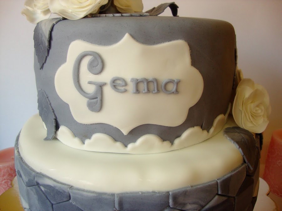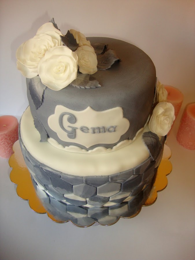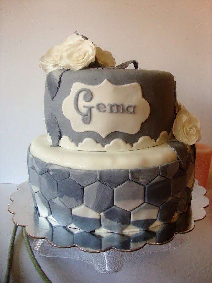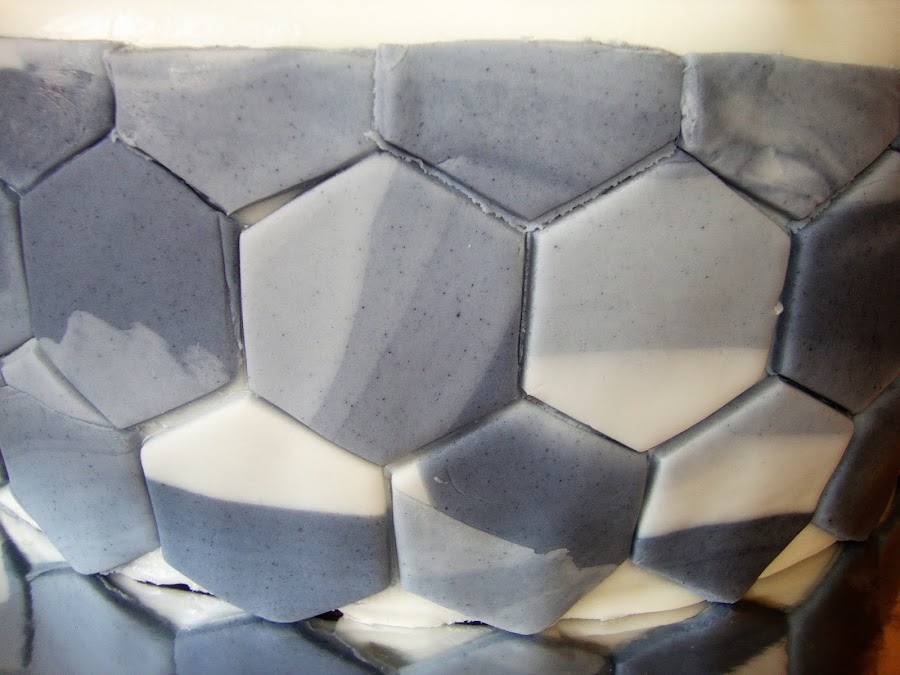 La decoración está realizada con fondant. La parte inferior con un efecto alicatado hexagonal en marmolado gris.