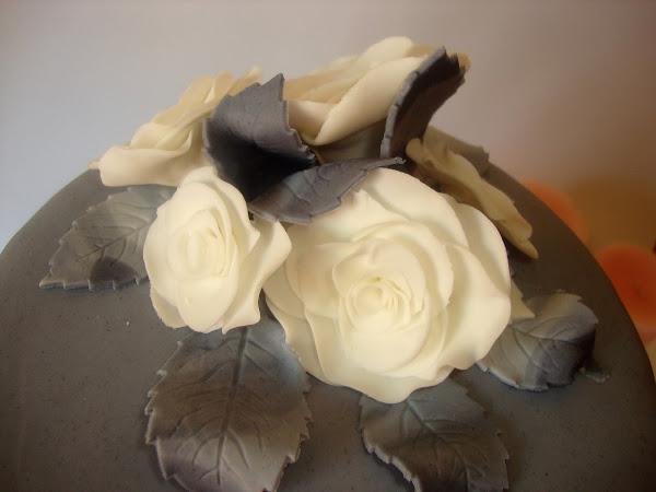 Coronando la tarta y en el lateral hay unas rosas blancas con hojas grises marmoladas realizadas con fondant.