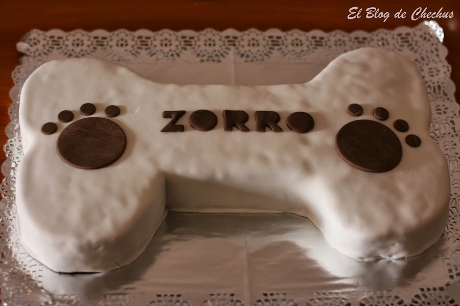 Me habían pedido cosas raras, pero esto me pareció, además muy divertido. Mi compañero Alex se ha comprado un perrito precioso, que se llama Zorro, tiene un mesecito, y quería hacer una comida en casa para "presentarlo" a la familia, una especie de bautismo, vamos. Me pidió que si podía hacerle una tarta en forma de hueso, y aquí tenéis como quedó.