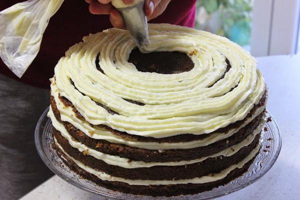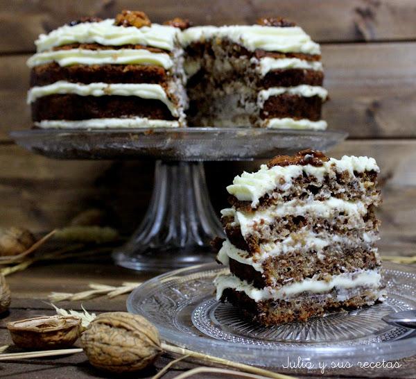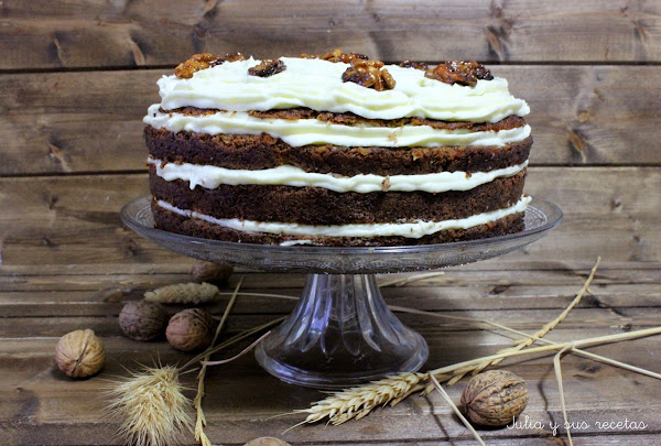 Montamos la tarta: Ponemos en la bandeja donde vayamos a servirla una rodaja de bizcocho, rellenamos con crema de queso, ponemos la siguiente y rellenamos, terminamos con al ultima y la cubrimos con la crema de queso. La adornamos con las nueces caramelizadas.