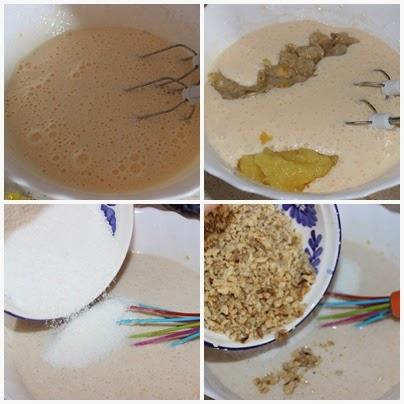 A continuación añadimos el puré de plátano y la piña picada, el coco rallado y las nueces molidas.