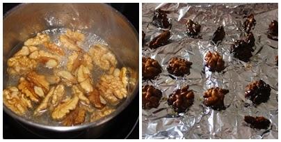 Caramelizamos las nueces: En un cazo ponemos el agua y el azúcar al fuego, cuando empiece a hervir añadimos las nueces y dejamos cociendo uno 10-12 minutos. Sacamos las nueces y las dejamos escurrir en un colador o en papel aliminio.