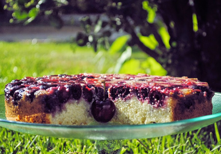 Hecha la masa con una cuchara y un poco de cuidado porque no queremos que las cerezas se distribuyan entre el bizcocho, sino que queden abajo y al desmoldarnos nos quede la fruta arriba, por eso se llama tarta invertida...