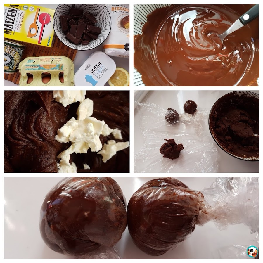1.- Preparamos el chocolate: Fundimos el chocolate en el microondas durante unos minutos sin que llegue a quemarse. Lo dejamos templar, mezclamos el chocolate fundido con el queso crema, el cacao en polvo y la canela. Formamos bolas de chocolate del tamaño de una pelota de golf. Cubrimos la bolas con papel flim, las guardamos en el congelador 30 minutos.